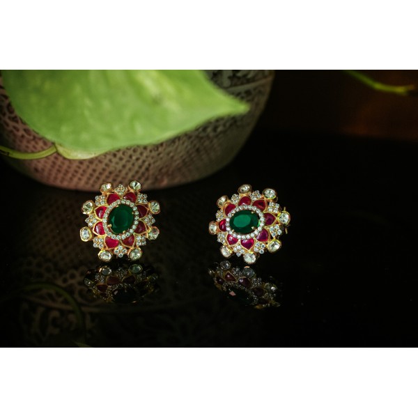 Silver Kundan Green and Red Stone Studs