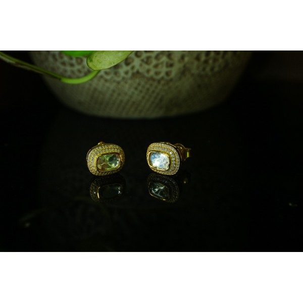 Silver Kundan Oval Stud Earrings with White Zircon