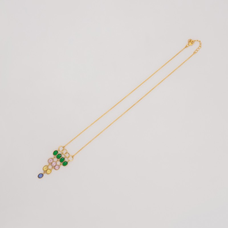 A vibrant and elegant silver necklace featuring tiered drops of harmoniously arranged colored stones. Designed for graceful movement and visual balance, it’s the perfect piece to add subtle color and charm to everyday or festive outfits.