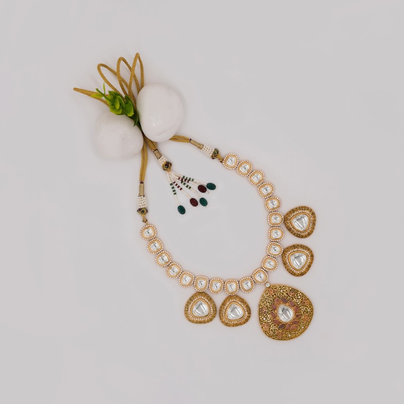 This mirror polki meenakari necklace showcases a stunning fusion of reflective mirror work and colorful enamel artistry. Intricately detailed with traditional motifs, it’s crafted on a polished metal base—making it perfect for festive styling and statement looks.