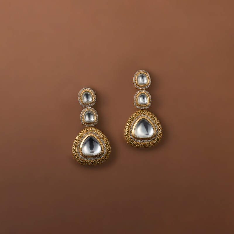 Make a bold and elegant statement with these exquisite non-gold ethnic designer earrings, crafted with high-polish mirror-finish stones and intricate metalwork detailing. These earrings feature a three-tier design with two cushion-cut stones at the top and a large teardrop-shaped centerpiece at the bottom — all framed in a beautifully engraved gold-tone base with antique swirl patterns.