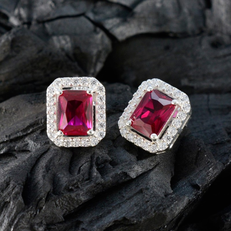 The Red CZ Rectangle Halo Stud Earrings feature a striking rectangle-shaped red cubic zirconia centerpiece, framed with a sparkling halo of clear CZ stones. A glamorous choice for evening wear, parties, and festive occasions.