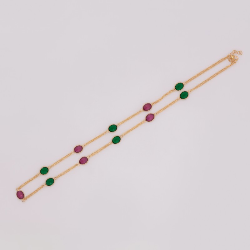 A timeless silver necklace featuring alternating ruby and emerald oval cabochon stones set in a clean, polished layout. With its rich color contrast and classic form, this piece is perfect for elegant everyday styling or special occasions.