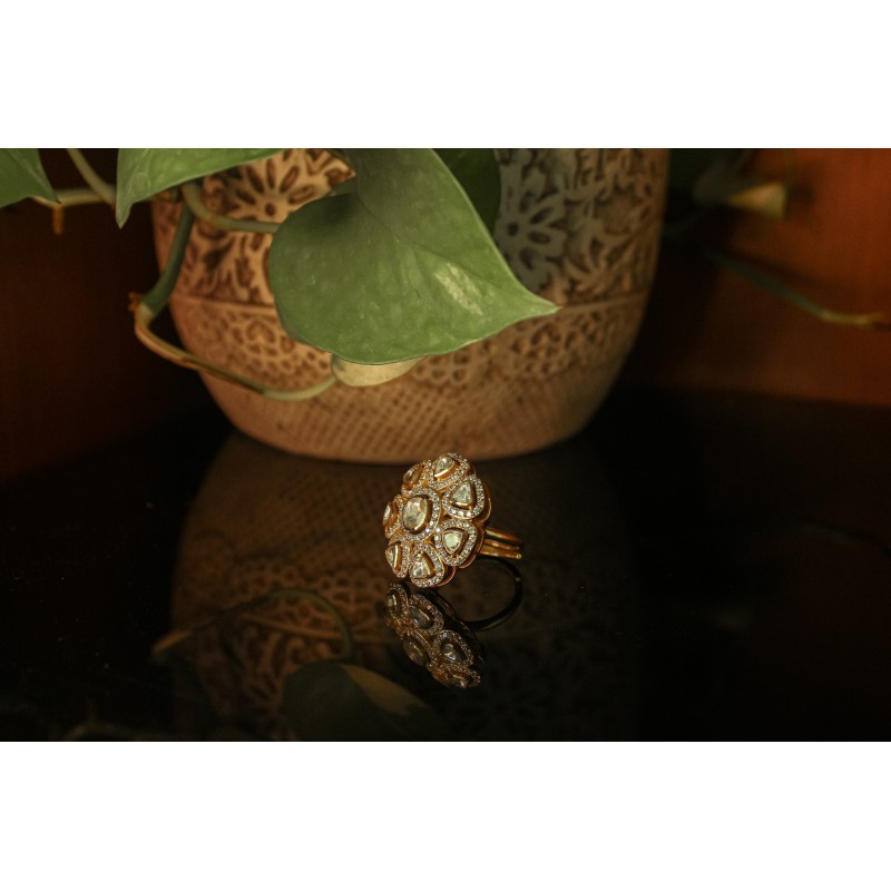 An exquisite Silver Kundan Ring adorned with sparkling white zircon stones in a floral-inspired design. Crafted with intricate detailing, this statement ring is perfect for weddings, festive occasions, and elegant evening wear.